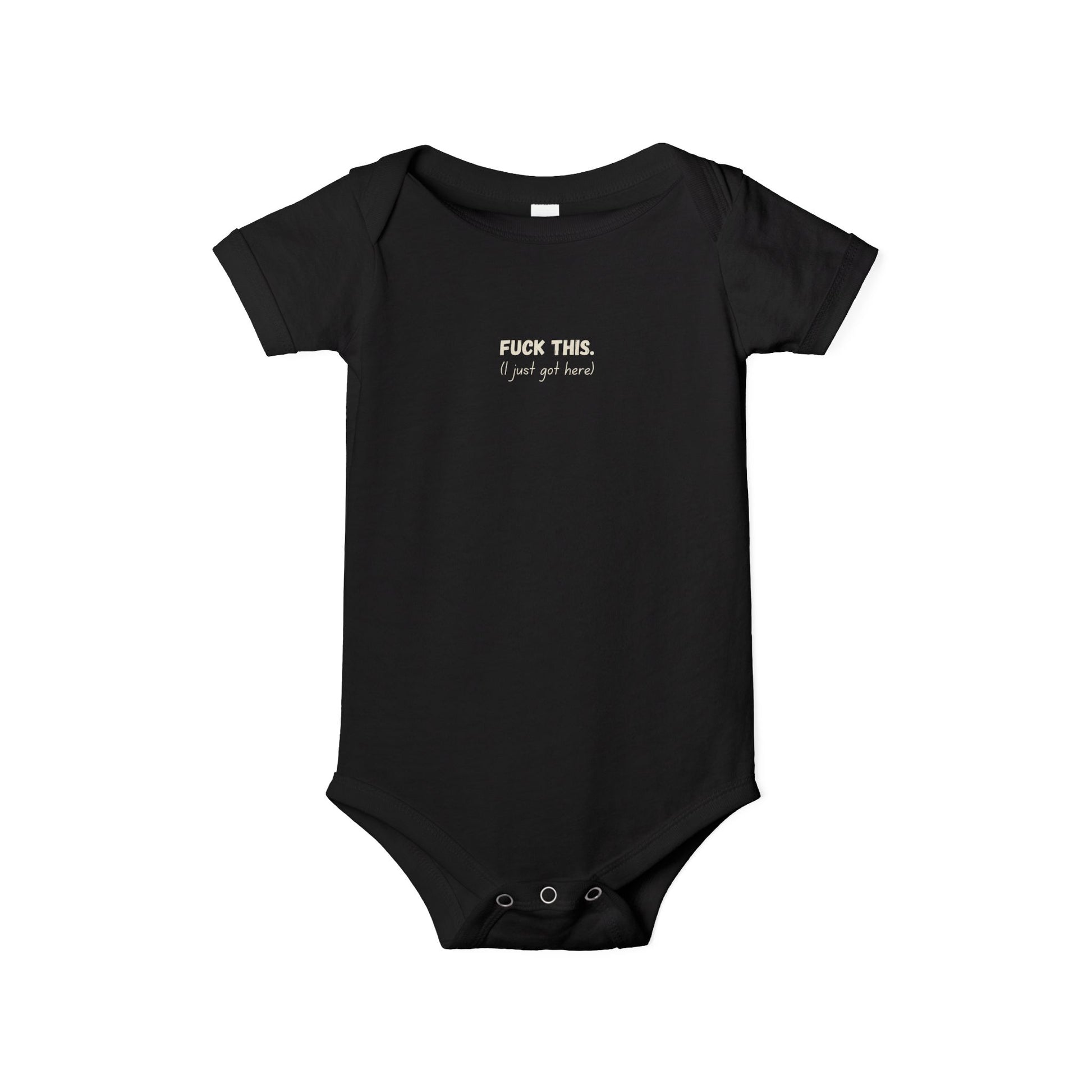 Start ‘em young with a little attitude and a lot of comfort. This hilarious "Fuck This. (I Just Got Here)" Infant Jersey One Piece is made from ultra-soft 100% Airlume combed and ring-spun cotton, perfect for babies who didn’t ask to be here—but are born to be rebels.